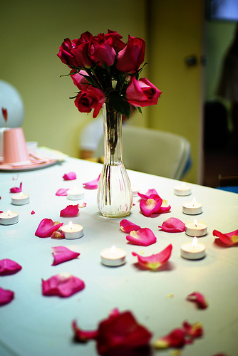 Or have lots of short stemmed roses bunched together in a cube vase, again you can bulk out the centerpiece by having tealights or petals around the vase.
