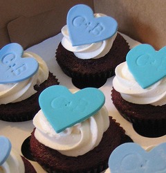 When all of your cupcakes are covered you will want to add the decorations and again this can be with fondant flowers, dots, bells, butterflies, anything that you want. Roll out the fondant for the decorations and use cookie cutters to cut out the shapes that you need. When you have all the shapes that you need take the wedding cupcakes out of the fridge and 'glue' them with water to the cakes, for heavier pieces of fondant you will need frosting to stick them to the cakes. |