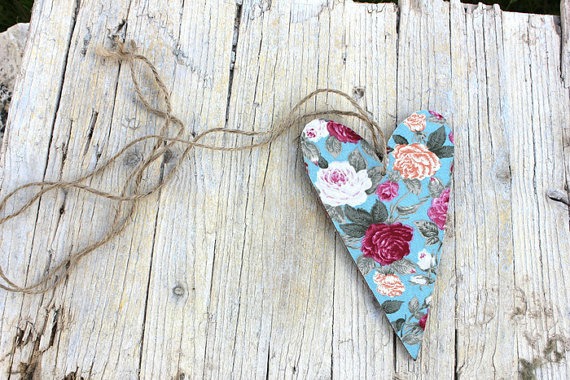 See if you can find some cheap vintage style wrapping paper or wallpaper which you could use to decorate cardboard hearts as seen in the photo or you could use the paper to decorate glass jars for vases and candles.