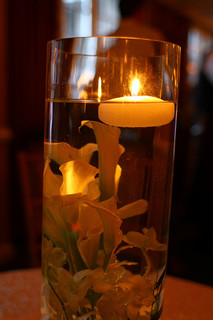 A popular centerpiece is to use cylinder vases with a floating candle in the top. It is worth buying bigger floating candles for this style as small ones end up floating to the side and won't stay in the middle of the water.